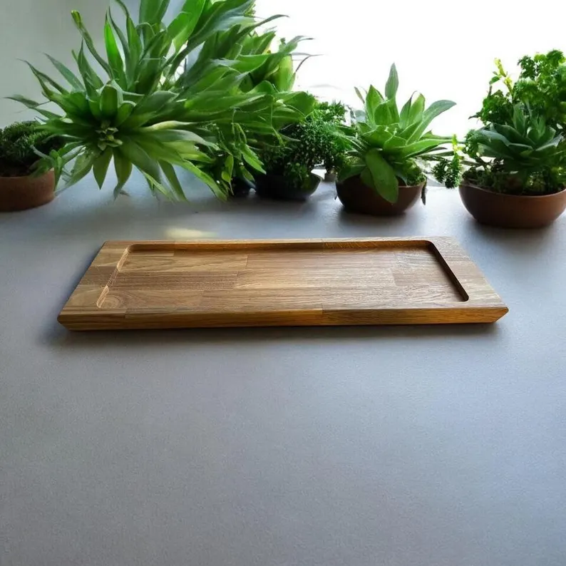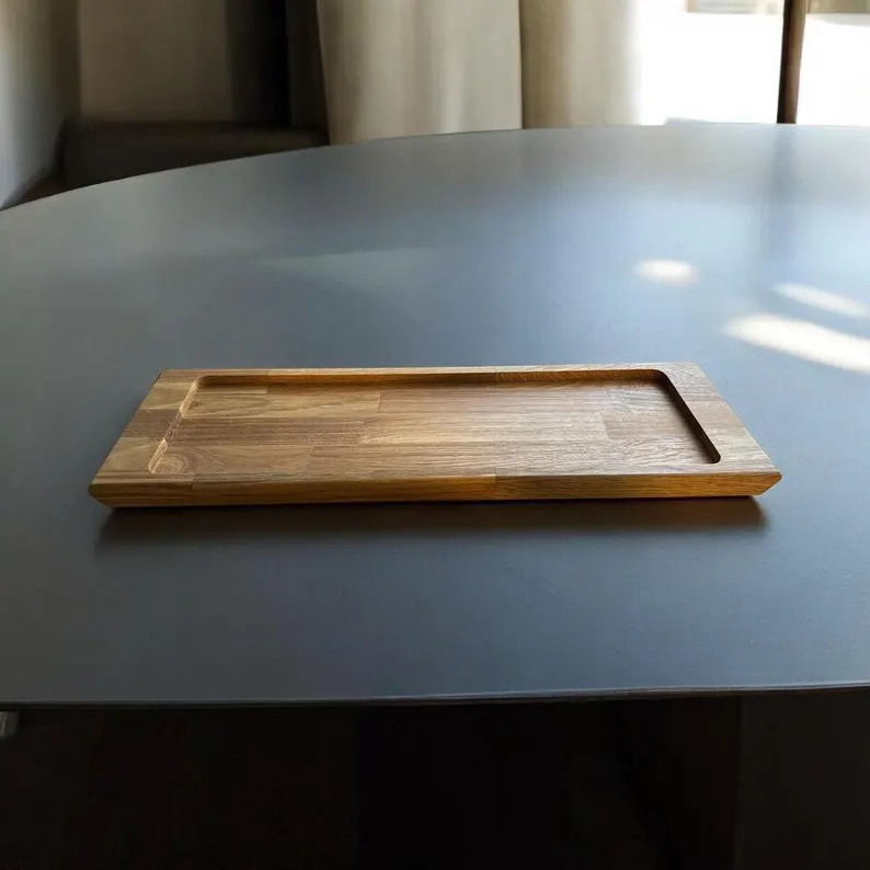 Modernes Design, abgerundete Kanten. Das Servierbrett wurde sorgfältig mit Öl behandelt, um nicht nur die natürliche Maserung zu betonen, sondern auch die Langlebigkeit und Pflegeleichtigkeit zu gewährleisten.